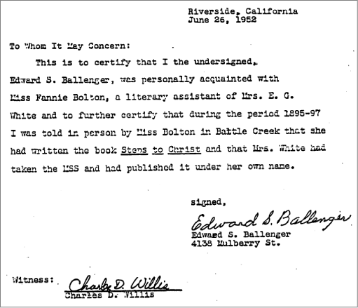 Fannie Bolton was employed by Mrs. White as an editorial assistant while the book was being written. Ms. Bolton joined Ellen White's staff in 1888, and Steps to Christ was published in 1892. Ms. Bolton made the following statement to Edward Ballenger, who provided a notarized copy in 1952: