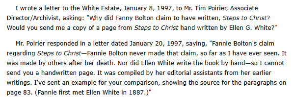 "...during the period 1895-97 I was told in person by Miss Bolton in Battle Creek that she had written the book Steps to Christ and that Mrs. White had taken the MSS and had published it under her own name."5