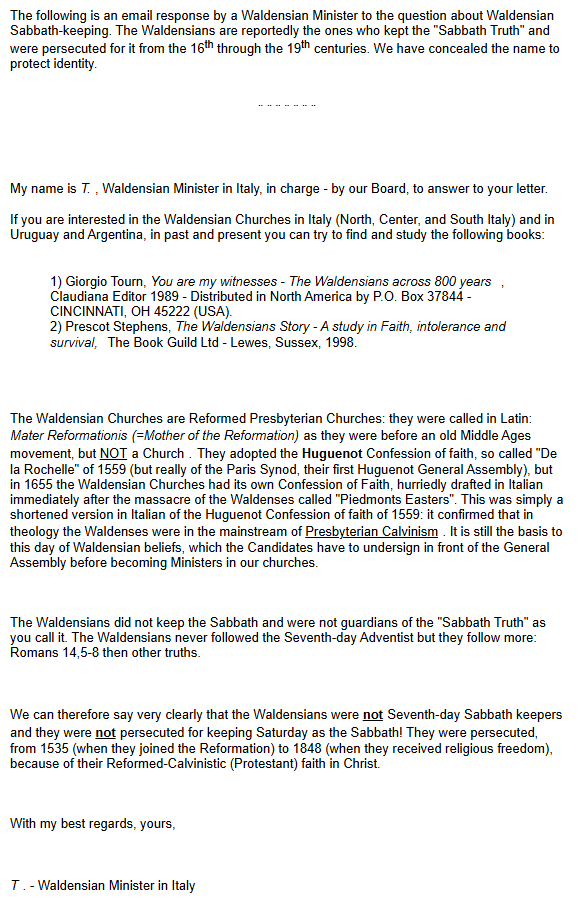 We can therefore say very clearly that the Waldensians were not Seventh-day Sabbath keepers and they were not persecuted for keeping Saturday as the Sabbath! They were persecuted, from 1535 (when they joined the Reformation) to 1848 (when they received religious freedom), because of their Reformed-Calvinistic (Protestant) faith in Christ.